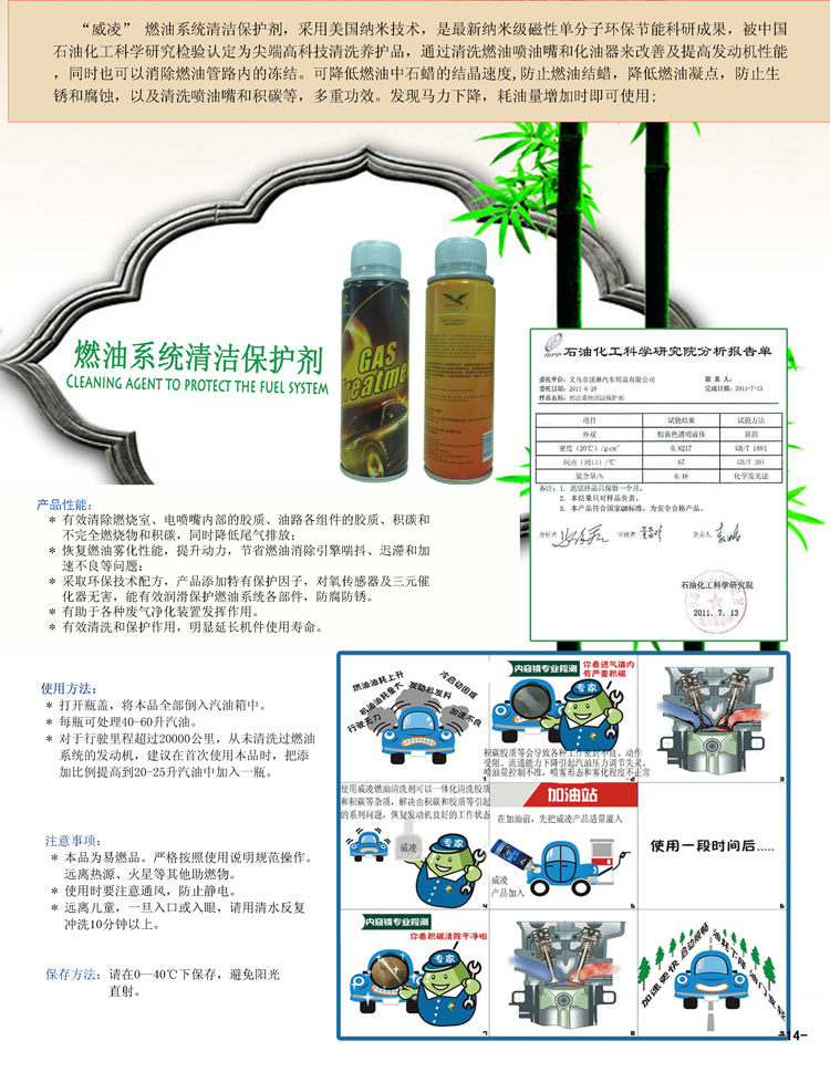"Weiling"Cleaning agent to protect the fuel system the U.S. nano-technology, nano-magnetic single-molecule latest environmentally friendly energy research, scientific tests by China Petroleum & Chemical identified as cutting-edge high-tech cleaning maintenance products.by cleaning fuel injectors and carburetor to improve and increase engine performance , but also can eliminate the fuel line freeze. Can reduce the rate of fuel in the crystallization of paraffin, wax to prevent fuel and reduce fuel freezing point, to prevent rust and corrosion, and clean fuel injectors and carbon deposits, etc., multiple effects. When horsepower decreased and fuel consumption increased, then can be used.