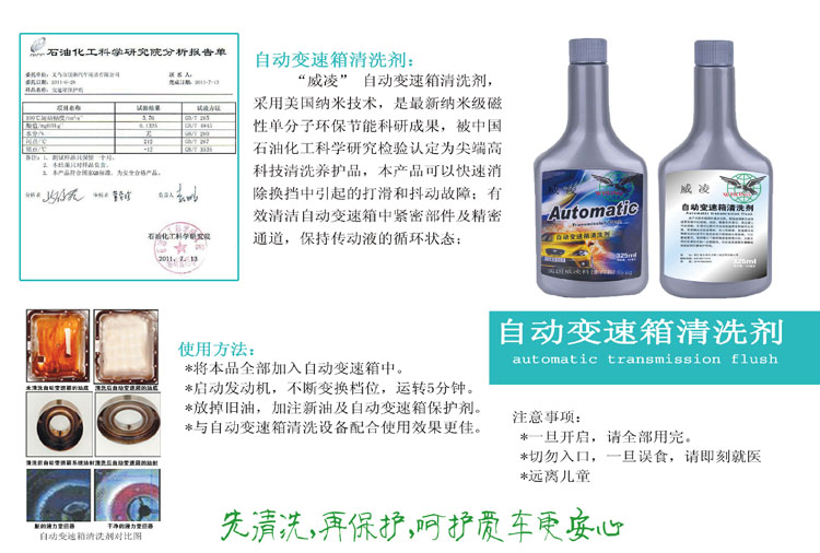 “威凌” 自動變速箱清洗劑,是美國納米技術,最新納米級磁性單分子環保節能科研成果,被中國石油化工科學研究檢驗認定為尖端高科技清洗養護品,本產品可以快速消除換擋中引起的打滑和抖動故障;有效清潔自動變速箱中緊密部件及精密通道,保持傳動液的循環狀態;
